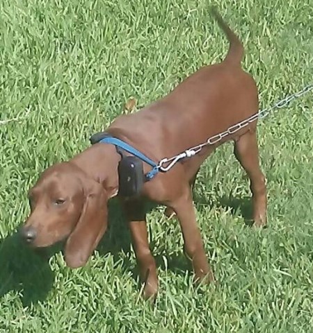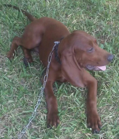 Handsome almost 4 month old redbone coonhound for sale. He is inquisitive and loves to play. He's UKC registered and has champion bloodlines both in competition and in the show ring. He has had some potty training and have started on a few simple commands. He's also been socialized and walks on his leash. He's had his first shots. He likes to roam and tracks/ plays with our cats. I have also started to train him to be ok with being tied up because he likes to get through our picket fence. Extremely smart and ready to please.