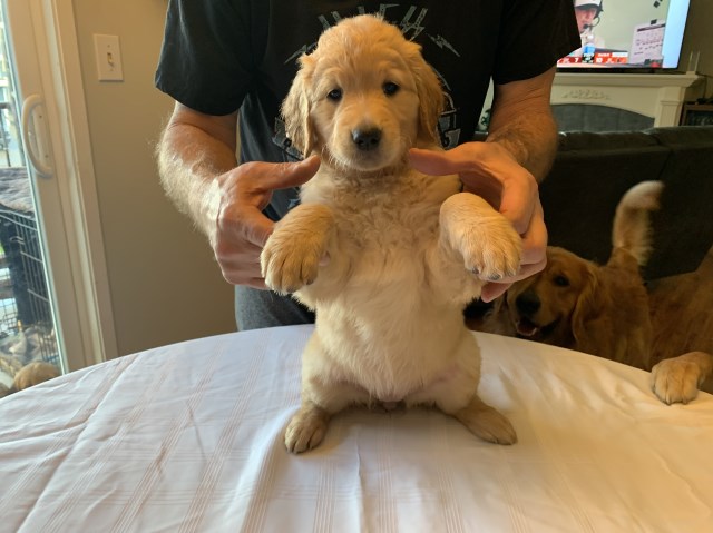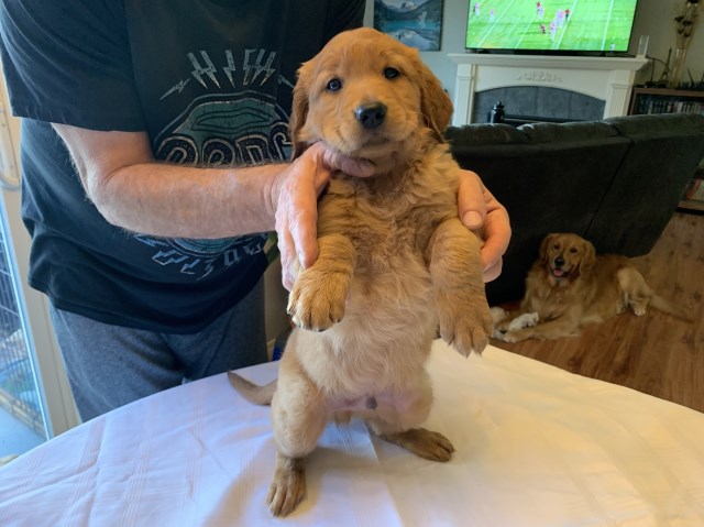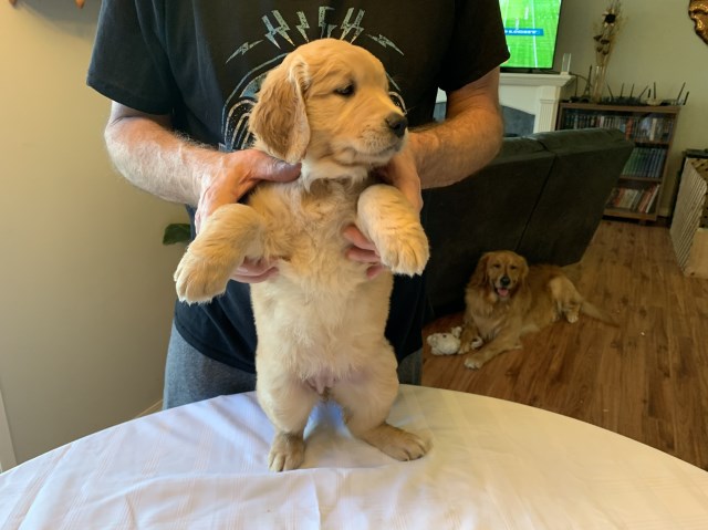 We have 7 Golden Retriever puppies ready for their new forever homes. We have both Mom and Dad if you wish to see pictures of them. We have 4 Males and 3 Females and was able to post only 5 individual pictures. They are pure bread puppies, and are being taught to not chew your furniture, and house plants. They are very friendly love cuddles and of course golden smart. We are in Chilliwack, BC, Canada and have documented their birth times along with growth in pictures and have them on Pro puppy food and natural snacks, as we are picky what they eat, rest is up to you. They have been bathed and groomed regularly and of course golden loves water. We have some that always love cuddles and, some hunters chasing toys and interacting with us but any day the Golden Retriever will always love you unconditionally. You can email us for pictures to theperfectaddress@yahoo.ca or respond within the website.