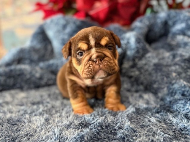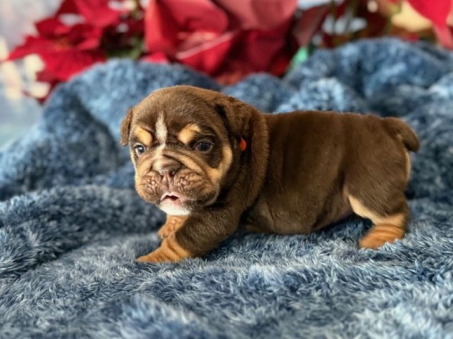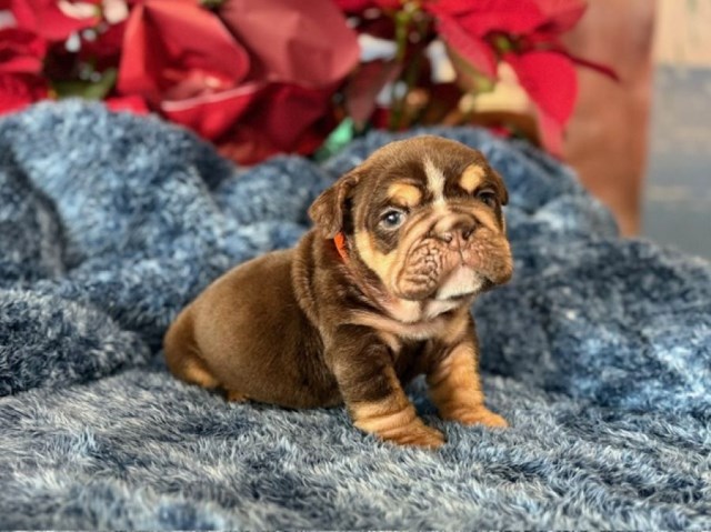Nera's OPHELIA wears an orange collar. Shes a lighter chocolate tri and super sweet !!, Genetic Health Tested CLEAR parents. litter of 10 (yes, thats right.. 10 siblings). This girl loves to snuggle and cant wait to find her new forever home. Im state licensed and inspected. Im also akc inspected. We have delivery options all over the usa. Facetime/video chat is highly encouraged so you can see your puppy in person before placing a deposit. $500 deposit reserves. Ready to Go 1/8/26 timeframe. all of our puppies have a 1yr genetic health guarantee, microchip, 2 sets of vaccines and several rounds of dewormings. We also include a loaded puppy kit full of supplies to get you started with your new baby. all of our pups come pre spoiled, used to loud noises and lots of activity around here. Any questions dont hesitate to contact us! look us up on our website at Green Akers Bulldogs.