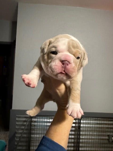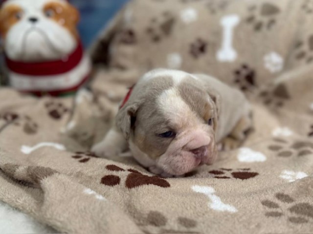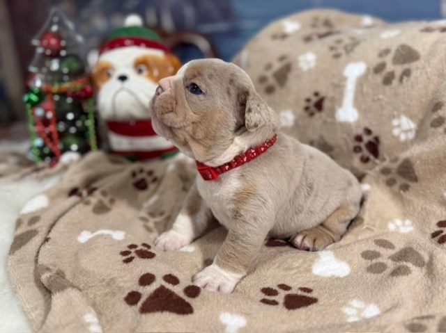 Elenors Male, red collar, Lilac merle, Genetic Health Tested CLEAR parents. litter of 5 and they all almost look identical, hence the color collars. This boy is vocal, loves to snuggle and cant wait to find his new forever home. Im state licensed and inspected. Im also akc inspected. We have delivery options all over the usa. Facetime/video chat is highly encouraged so you can see your puppy in person before placing a deposit. $500 deposit reserves. Ready to Go 1/8/26 timeframe. all of our puppies have a 1yr genetic health guarantee, microchip, 2 sets of vaccines and several rounds of dewormings. We also include a loaded puppy kit full of supplies to get you started with your new baby. all of our pups come pre spoiled, used to loud noises and lots of activity around here. Any questions dont hesitate to contact us! look us up on our website at Green Akers Bulldogs.