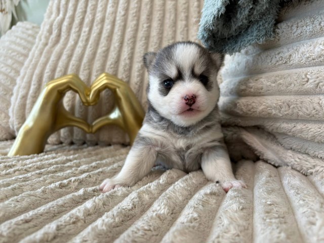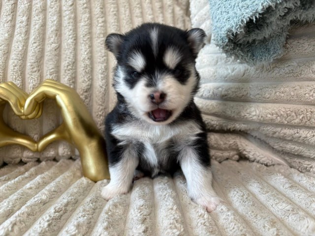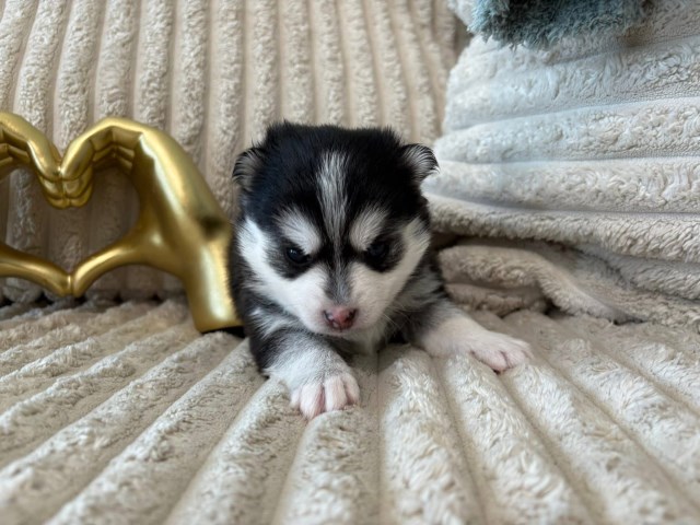 One beautiful male and 5 female pomsky puppies. Double blue eyes and bi eyes available. Some charting 10-12 a couple 20-25. Puppies are 3 weeks old and born January 4th. We are extremely picky who are babies go home to all super sweet. Are raised in our home along side our 3 kids and other dogs and pets. We work very hard to desensitize our babies to every day activities and loud noises such as but not limited to the vacuum cleaner. Our puppies will begin potty mat training at 4 weeks old and previous litter have been mat trained by the time they went home. We also offer early introduction to the crate to make their transition from own home to yours more comfortable for you and them if you have any other questions please don’t hesitate to call or text and ask. 2192421820 (my number is linked to my cleaning business so you don’t think you have the wrong number :) ) have a wonderful day