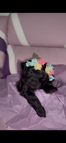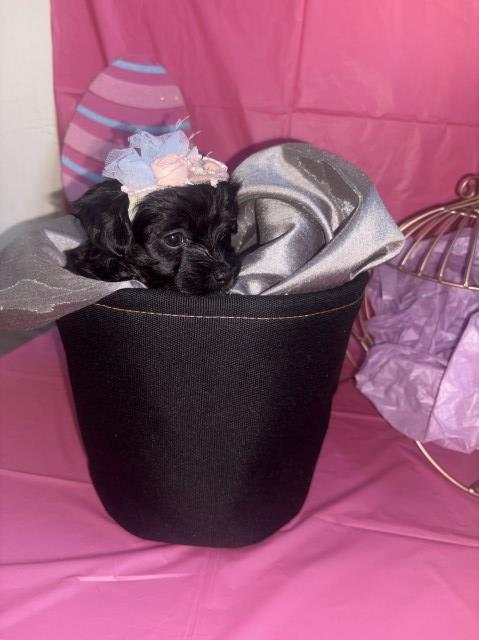 ?? Meet Cotton ?? Cotton is a beautiful, tiny black Yorkiepoo with the sweetest personality. She has a soft black coat with the cutest little hints of white on her back toes. She is very small, playful, affectionate, and loves being around people. Cotton is being raised in a loving, clean home environment where she is handled daily and well socialized. She is receiving plenty of care, attention, and love to help her grow into a confident and affectionate companion. She will come with her first vaccine, deworming, and a health guarantee with vet exam. Cotton will be ready for her new loving home at 8 weeks old. For more information contact me at nieshagrant1994@